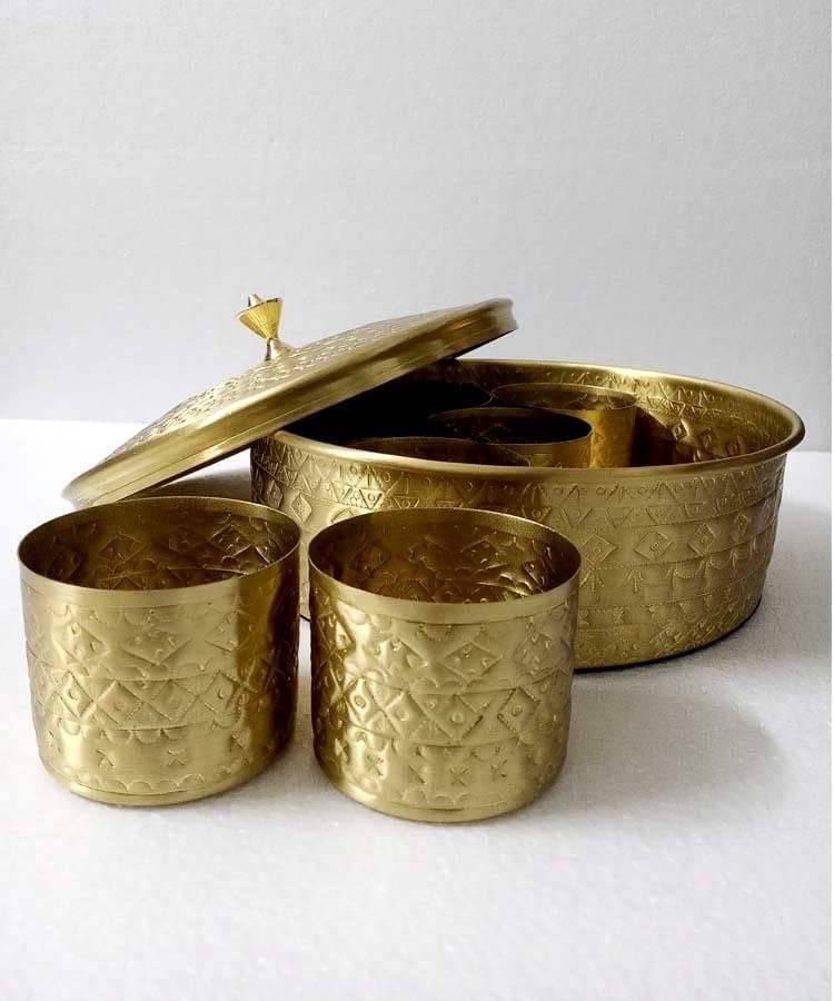 กล่องใส่เครื่องเทศโลหะทองเหลืองภาชนะในครัวกล่องใส่เครื่องเทศอินเดียกล่องทองพร้อมฝาช้อน