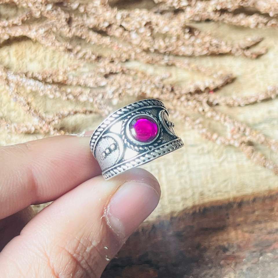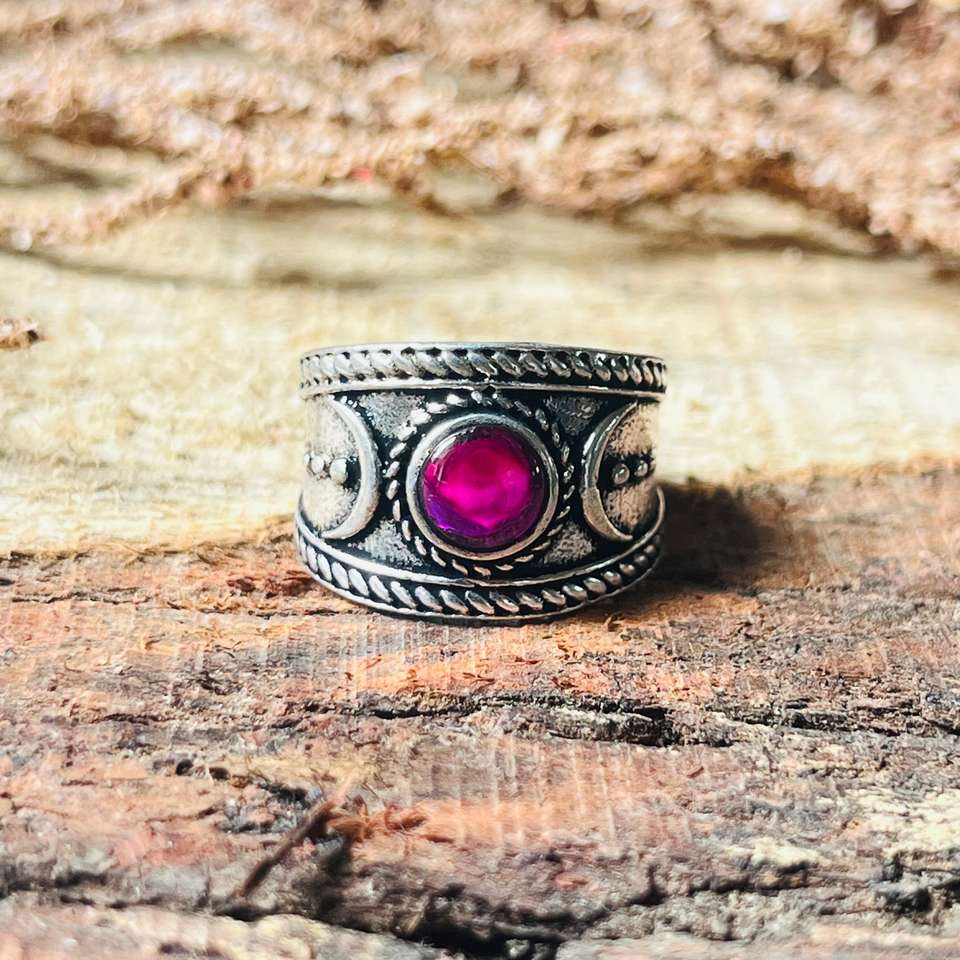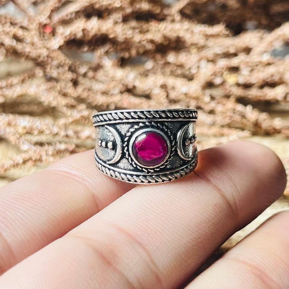 Brass Moon Ring Wide Band Boho Celestial Rhodolite Garnet Ring For Women Oxidized Silver Gothic Statement Jewelry Wholesale