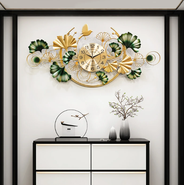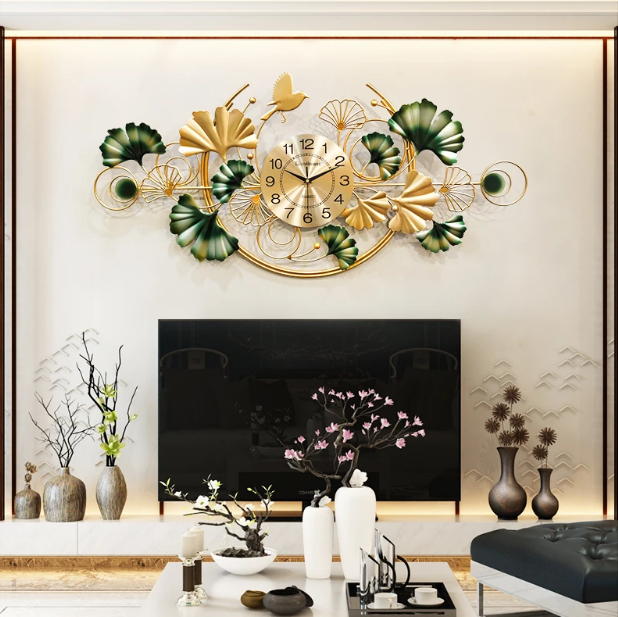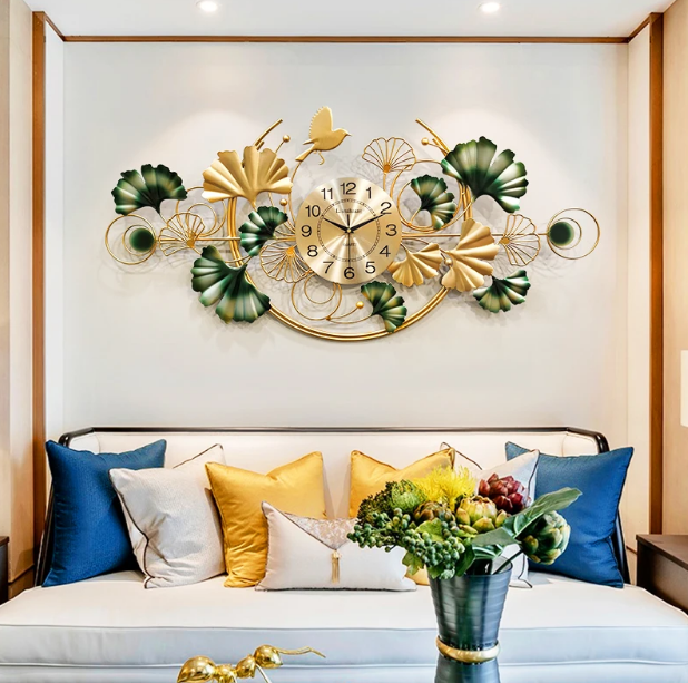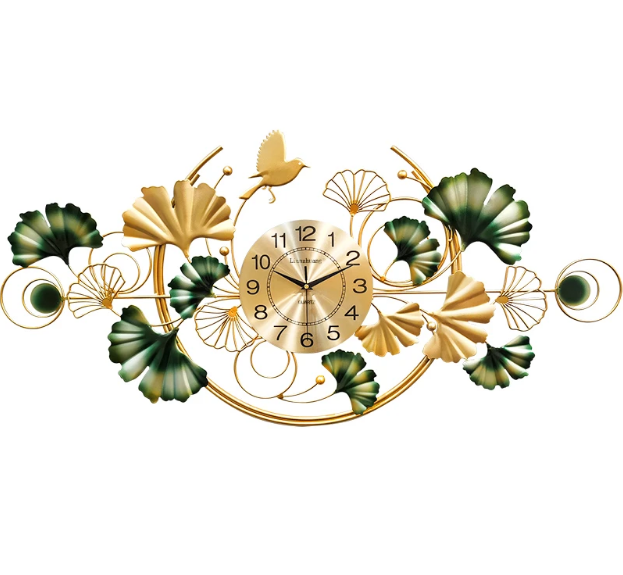 นาฬิกาแขวนผนังโลหะรูปพระจันทร์ทองเหลืองทรงใบไม้ขนาดใหญ่ปิดเสียงด้วยการตกแต่งหลากสีสำหรับงานแต่งงานตกแต่งบ้าน