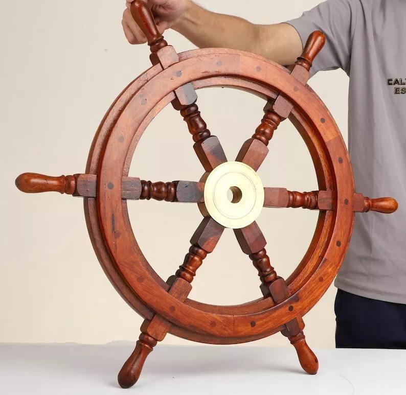 พวงมาลัยเรือไม้ทรงกลมขนาด 24 นิ้ว ทาสี ทำมือ ขัดเงา สไตล์วินเทจ ของตกแต่งบ้าน ของขวัญสำหรับกัปตันโจรสลัด