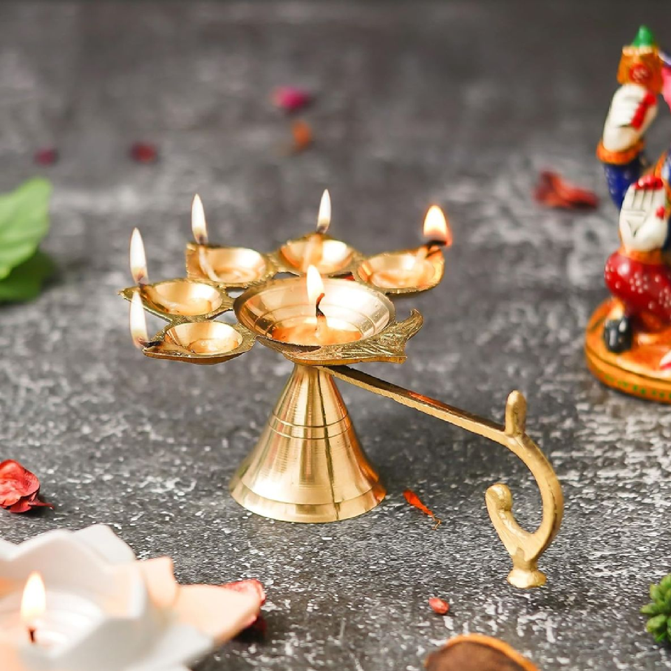 ทองเหลือง panchaarti Diya มีห้าชามรูปดอกบัวสำหรับไส้ตะเกียงบนฐานทรงกรวยฉัตรที่มีด้ามจับขายส่ง
