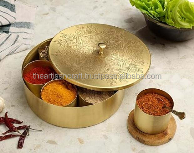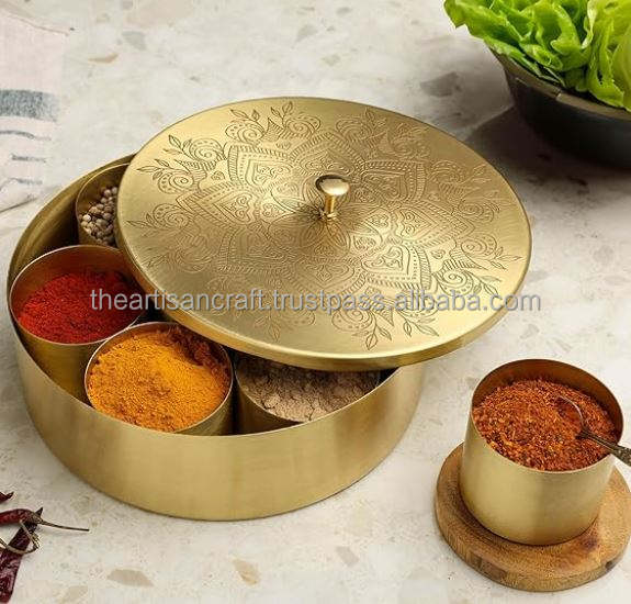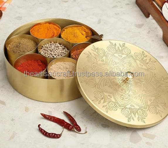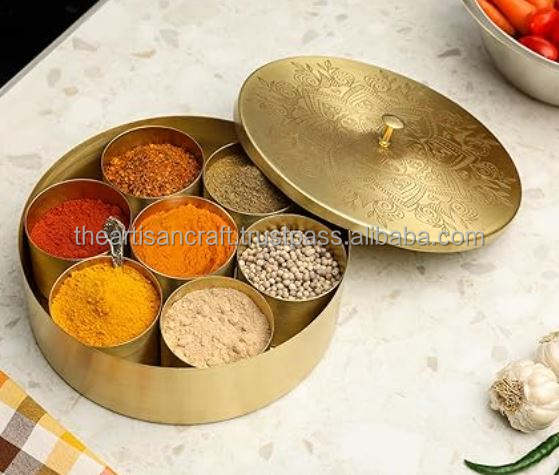กล่องใส่เครื่องเทศทองเหลืองกล่องใส่เครื่องเทศ Masala dabba 7ชิ้น-เป็นมิตรกับสิ่งแวดล้อมปรับแต่งได้โลโก้ขนาดสำหรับจัดเก็บเครื่องเทศในห้องครัวงานฝีมือช่างฝีมือ