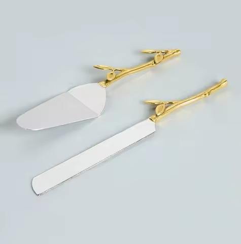 ชุดที่ตักเค้กทองเหลือง ดีไซน์ด้ามจับกิ่งบาง พร้อมใบไม้เล็กๆ ด้ามจับสีทอง ใบมีดสแตนเลส