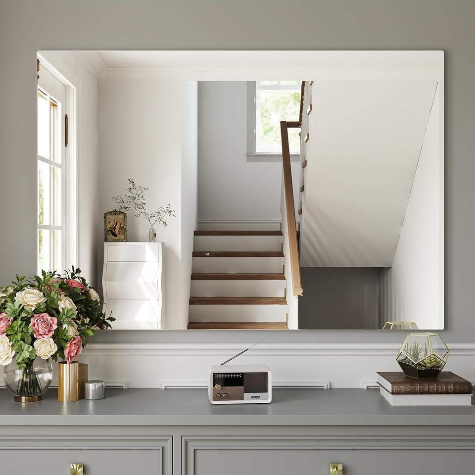 Brauthon กระจกโต๊ะเครื่องแป้งห้องน้ำทรงรี48 "x 30" กระจกเทมเปอร์ขนาดใหญ่ติดผนังสี่เหลี่ยมสำหรับอ่างล้างจานดีไซน์ทันสมัย