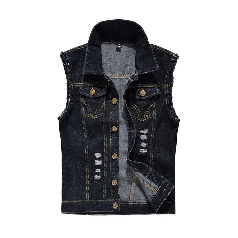 เสื้อกั๊กผ้ายีนส์ระบายอากาศสำหรับผู้ชายเสื้อแจ็กเก็ตยีนส์แขนกุดแบบย้อนยุคสำหรับฤดูใบไม้ร่วง