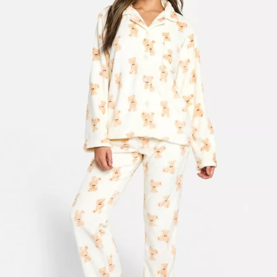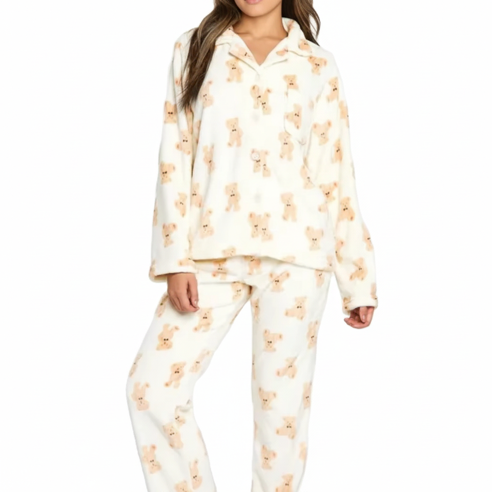ชุดนอนหมีระบายอากาศชุดเสื้อและล่างสำหรับห้องผู้หญิงชุด2ชิ้นลายหมีขนแกะพิมพ์ลายหมีน่ารัก