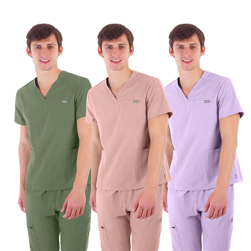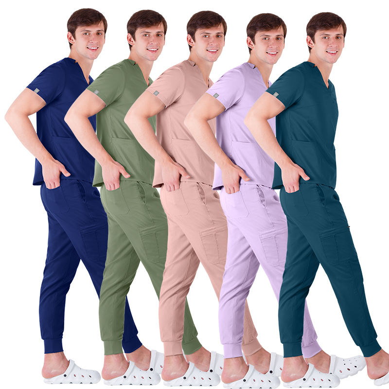 ชุดเครื่องแบบพยาบาลผ้าสครับสีม่วงสำหรับผู้ชายกางเกงยางยืดมีความยืดหยุ่นโลโก้สำหรับทางการแพทย์สวมใส่สบายระบายอากาศ