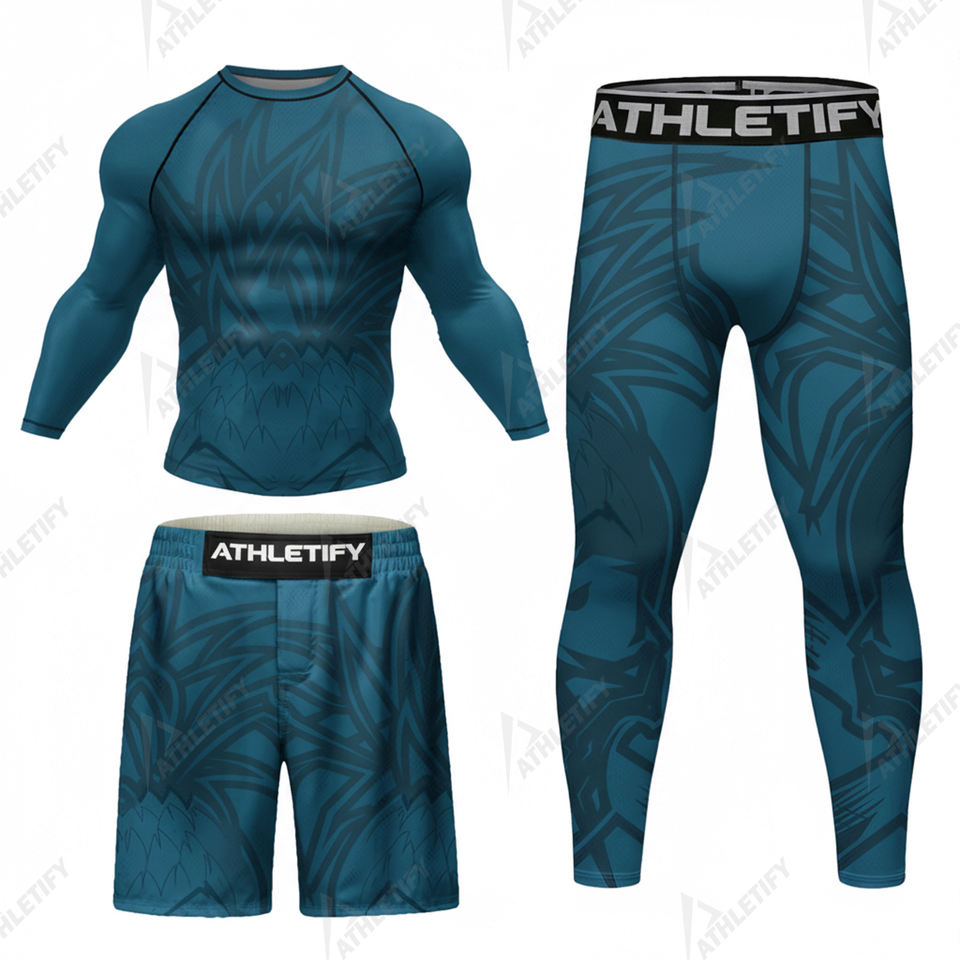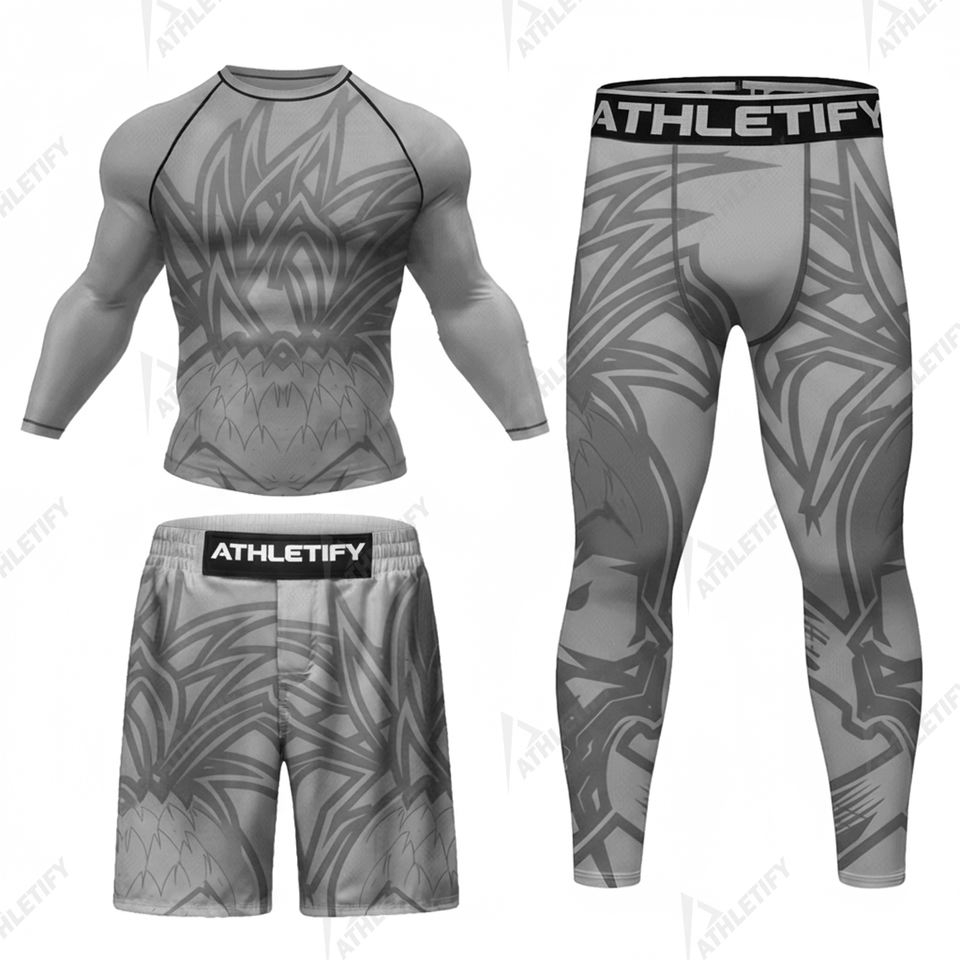 ชุดกีฬาแบบระบายอากาศได้ดี ชุดรัดกล้ามเนื้อแบบซับลิเมชั่น สำหรับทุกเพศ เสื้อรัดกล้ามเนื้อ กางเกงขาสั้น และกางเกงรัดรูป สำหรับ MMA ฟิตเนส วิ่ง แห้งเร็ว