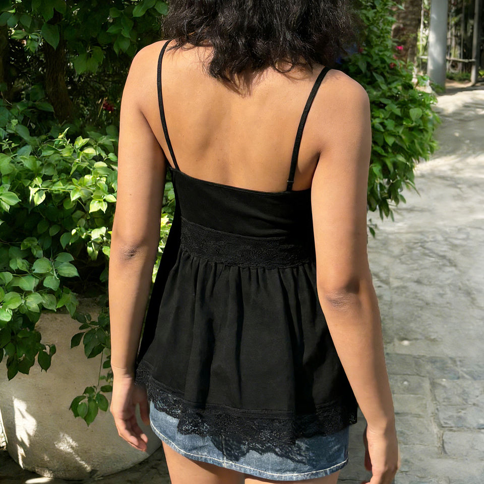 เสื้อสายเดี่ยวแขนกุดแต่งระบายลูกไม้แบบกอธิคสีดำระบายอากาศได้มีกระดุมด้านหน้าทรงหลวมเหมาะสำหรับผู้หญิง