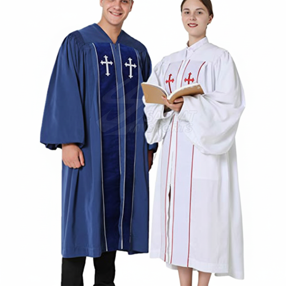 เสื้อคลุมโบสถ์ผ้าระบายอากาศสำหรับการบริการสภาพอากาศที่อบอุ่นเสื้อคลุมโบสถ์สีขาวคลาสสิกพร้อมเย็บปักถักร้อยสีทอง