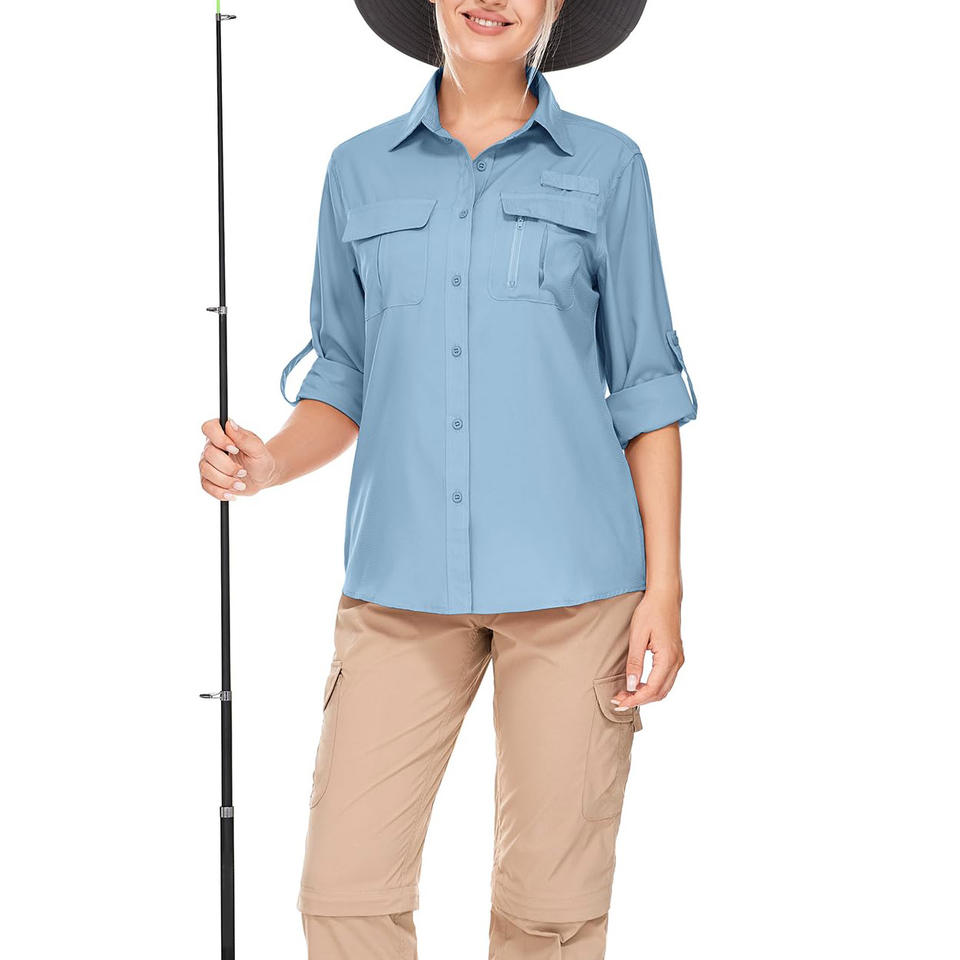 เสื้อตกปลาผ้าโพลีเอสเตอร์ผสมสแปนเด็กซ์ระบายอากาศได้ดีสำหรับผู้หญิง เสื้อผ้าสำหรับกิจกรรมกลางแจ้ง พิมพ์ลายตามสั่ง เสื้อตกปลาสำหรับผู้หญิง