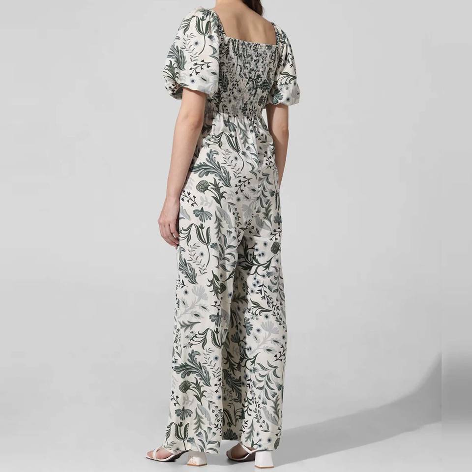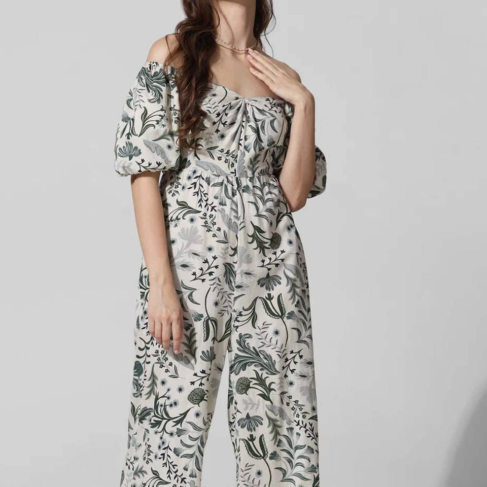 จั๊มสูทขากว้างสำหรับผู้หญิงชุดบอดี้สูทสตรีทสีพื้นผ้าคอตตอนปักลายขา100%