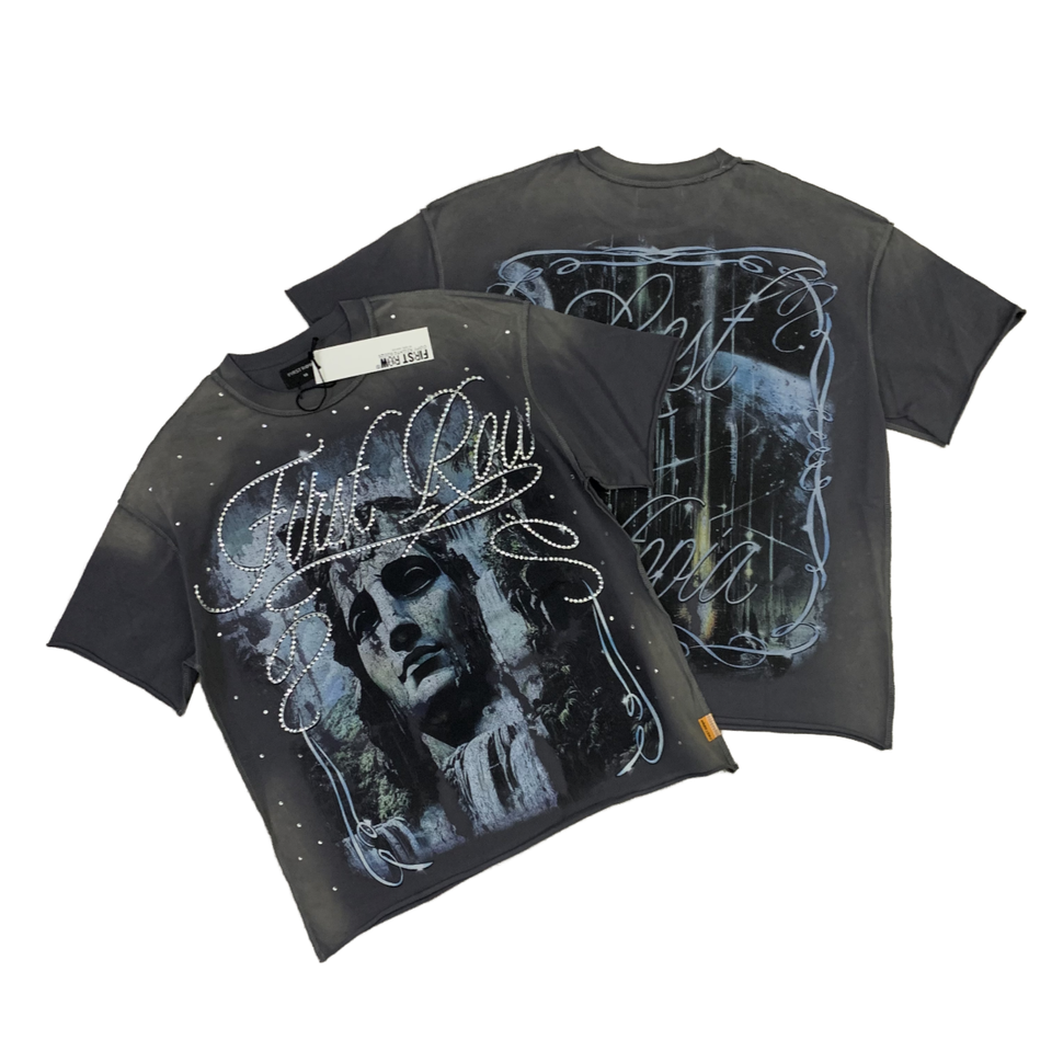 เสื้อยืดแขนสั้นพิมพ์ลายลำลองทรงโอเวอร์ไซส์ผ้าถักระบายอากาศประดับคริสตัลแบบวอช ขายส่ง