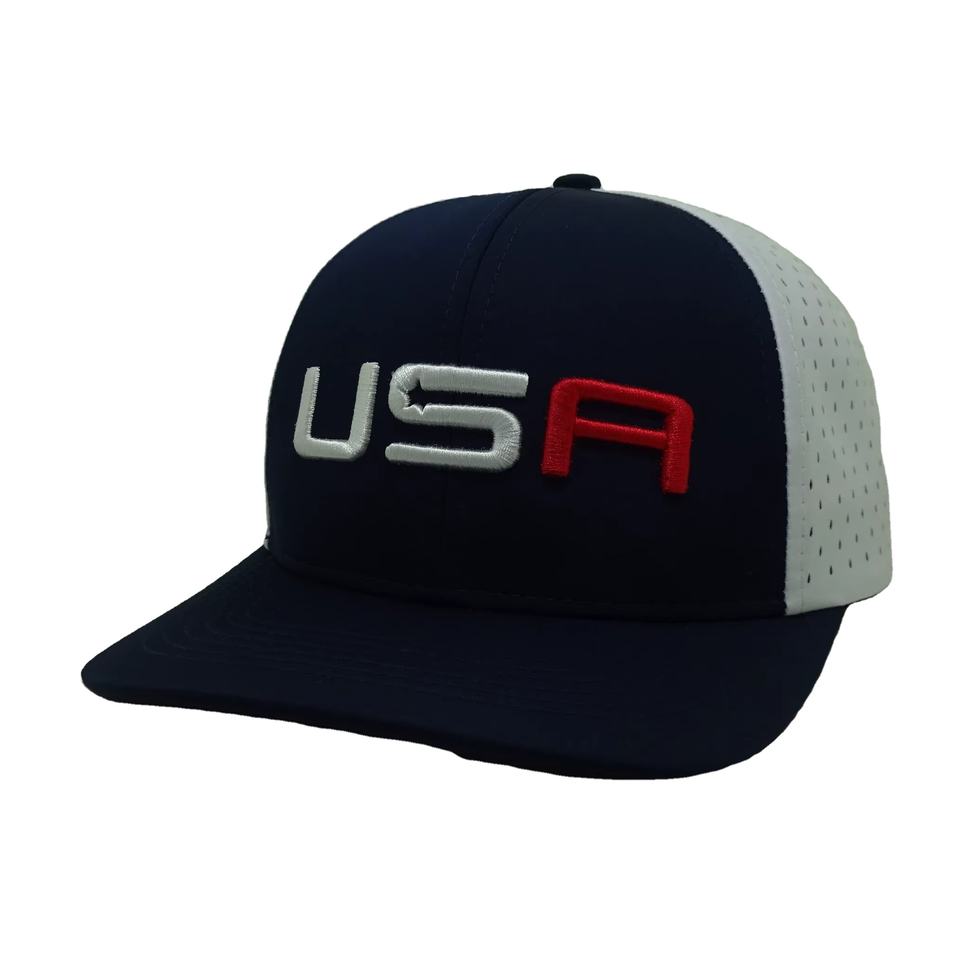 หมวกแก๊ปเลเซอร์ระบายอากาศได้ดี สีกรมท่าขาว สองสี ปักลาย USA หมวกเบสบอลแบบ Snapback ตาข่าย หมวกกอล์ฟ ขายส่ง
