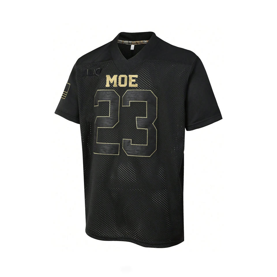 เสื้อฟุตบอลอเมริกันผ้าโพลีเอสเตอร์ระบายอากาศได้ดี สีดำทองพิมพ์ลายตัวเลขแบบเมทัลลิก คอวี ชุดทีม OEM ผลิตตามสั่ง