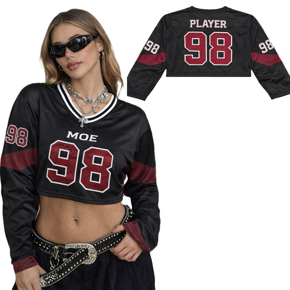 เสื้อเจอร์ซีย์อเมริกันฟุตบอลแขนยาวผ้าโพลีเอสเตอร์ระบายอากาศสำหรับผู้หญิง สไตล์สตรีทแวร์ เสื้อกีฬา รับผลิตตามแบบ OEM แบรนด์ส่วนตัว