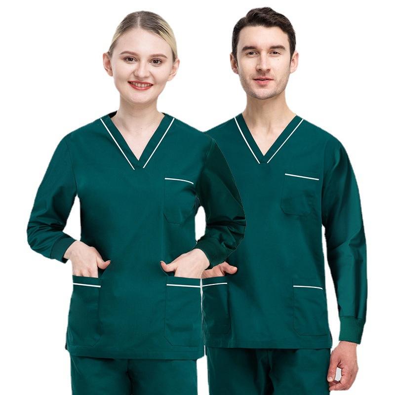 ชุดเครื่องแบบแพทย์ผ้าฝ้ายโพลีเอสเตอร์แขนยาวระบายเหงื่อสำหรับผู้ชายผู้หญิงขายส่ง