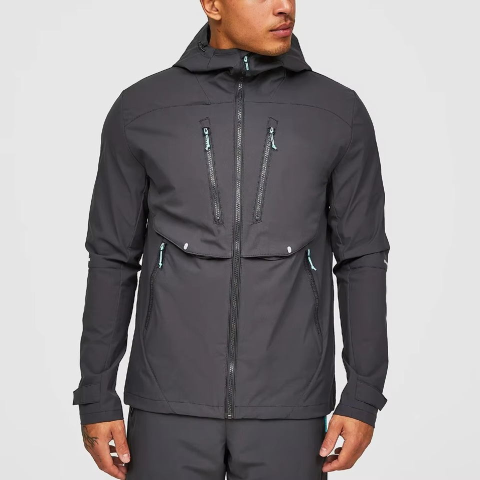 เสื้อแจ็คเก็ตอเนกประสงค์สีเทา ระบายอากาศ กันน้ำ กันลม ดีไซน์มีฮู้ด ปรับขนาดข้อมือได้ ขายส่งเสื้อแจ็คเก็ตสำหรับกิจกรรมกลางแจ้ง แฟชั่น