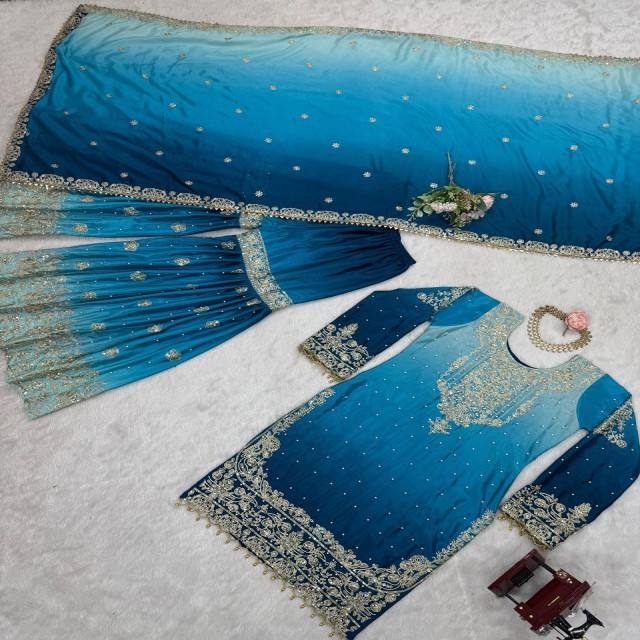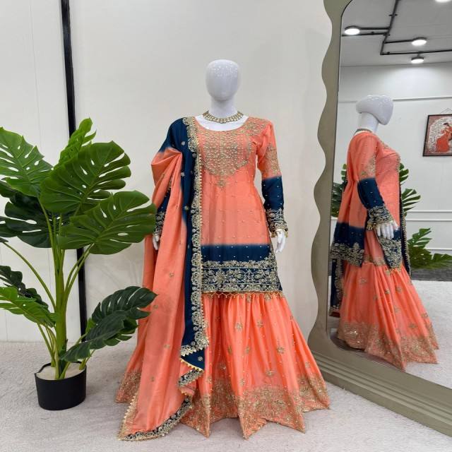 ชุดไชน็อบสำหรับเจ้าสาวและเทศกาลสวมใส่พร้อมการเข้ารหัสลำดับและการตกแต่งไข่มุกรวมถึง dupatta และ sharara