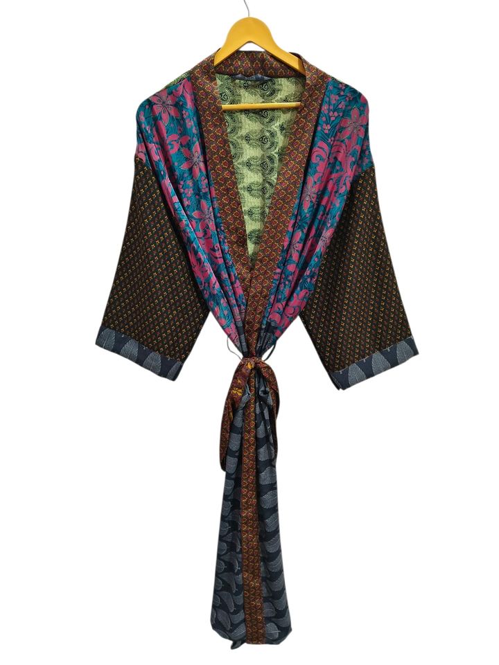 เสื้อคลุมเจ้าสาวน้ำหนักเบาชุดคลุมผ้าไหมสำหรับผู้หญิงชุดนอนเสื้อคลุมยาวพิมพ์ลายดอกไม้อินเดียชุดกิโมโนผ้าไหมส่าหรีรีไซเคิลวินเทจ