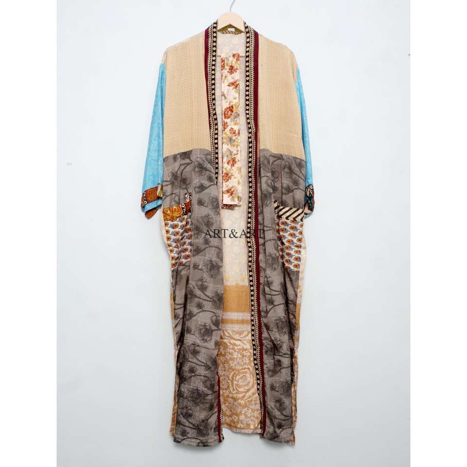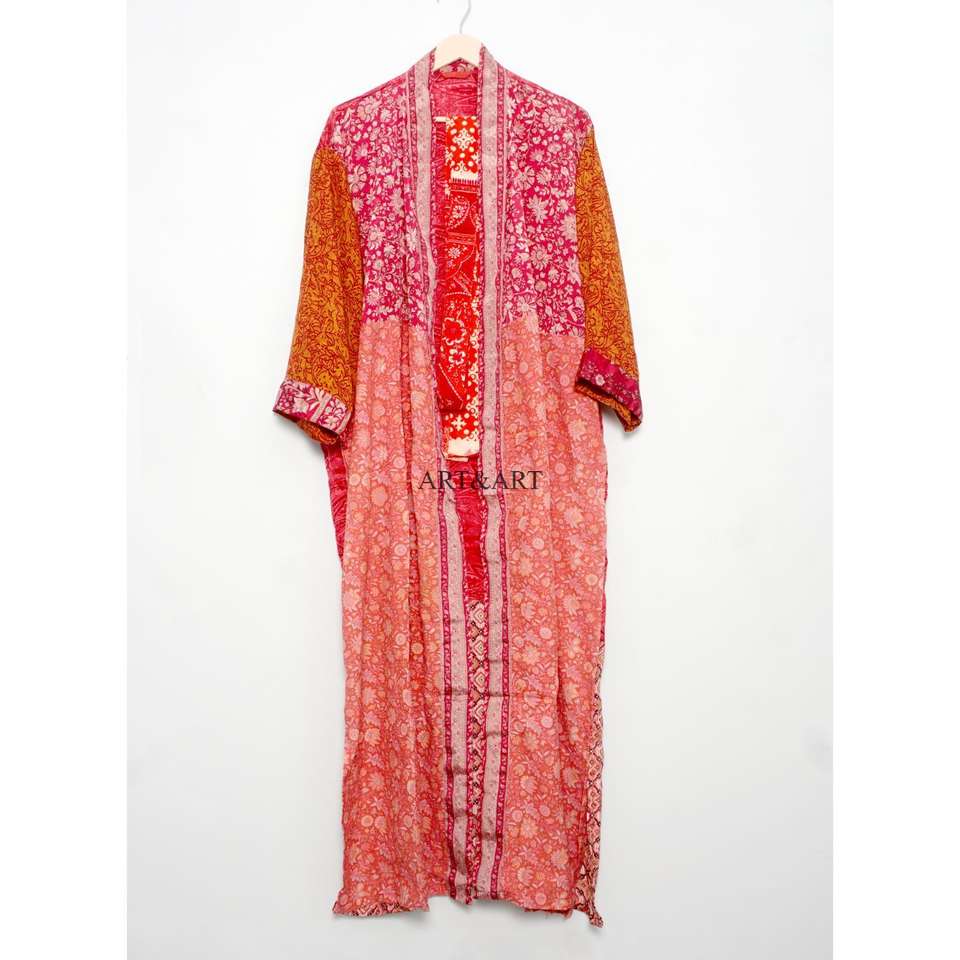 ชุดคลุมเจ้าสาวผ้าไหมน้ำหนักเบาสำหรับผู้หญิง ชุดนอนคลุมยาว ลายดอกไม้ สไตล์อินเดีย วินเทจ ผ้าไหมซารีรีไซเคิล คิโมโน