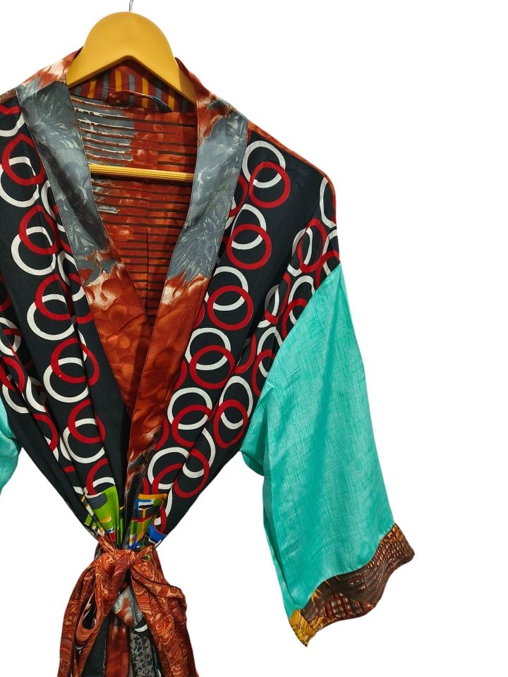 ชุดคลุมกิโมโนผ้าไหมปะติดปะต่อแบบส่าหรีสำหรับเจ้าสาว ชุดคลุมบิกินี่ ชุดนอน ชุดคลุมยาว งานแฮนด์เมดสไตล์อินเดีย วินเทจ ทำจากผ้าไหมส่าหรีรีไซเคิล