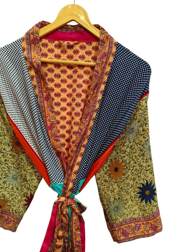 ชุดคลุมกิโมโนผ้าไหมปะติดปะต่อแบบส่าหรีสำหรับเจ้าสาว ชุดคลุมบิกินี่ ชุดนอน ชุดคลุมยาว งานแฮนด์เมดสไตล์อินเดีย วินเทจ ทำจากผ้าไหมส่าหรีรีไซเคิล