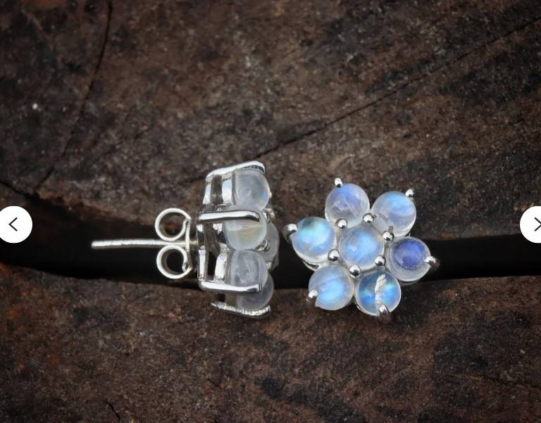 ต่างหูเพื่อนเจ้าสาวทรงหลังเบี้ยธรรมชาติสีฟ้าไฟมูนสโตนตั้งอยู่ทรงง่ามตุ้มหูทองเหลืองชุบเงินมีดีไซน์รูปดอกไม้