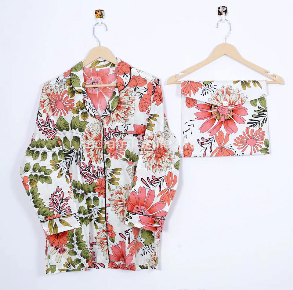 เพื่อนเจ้าสาวชุดนอนบล็อกมือพิมพ์ผ้าฝ้ายชุดนอนสุภาพสตรีชุดราตรีชุดนอนดอกไม้ชุดนอนสตรี