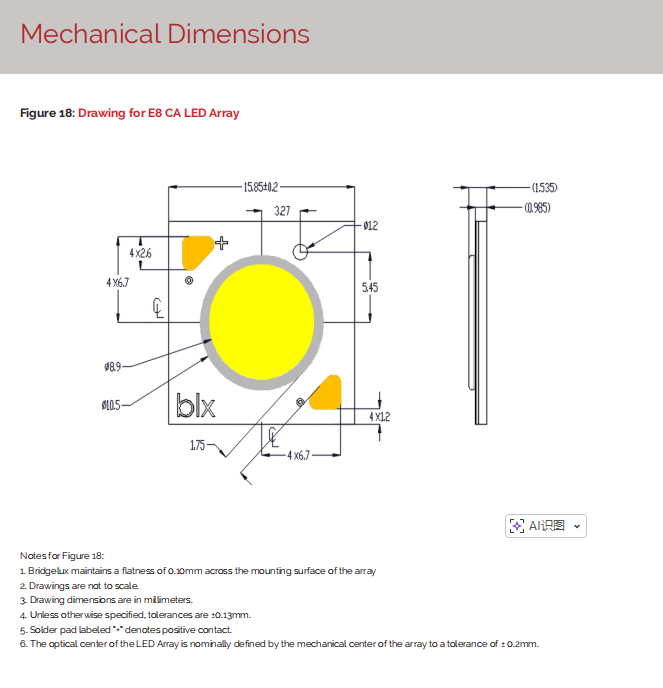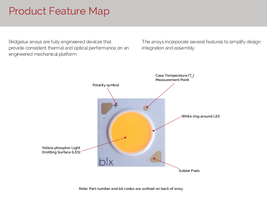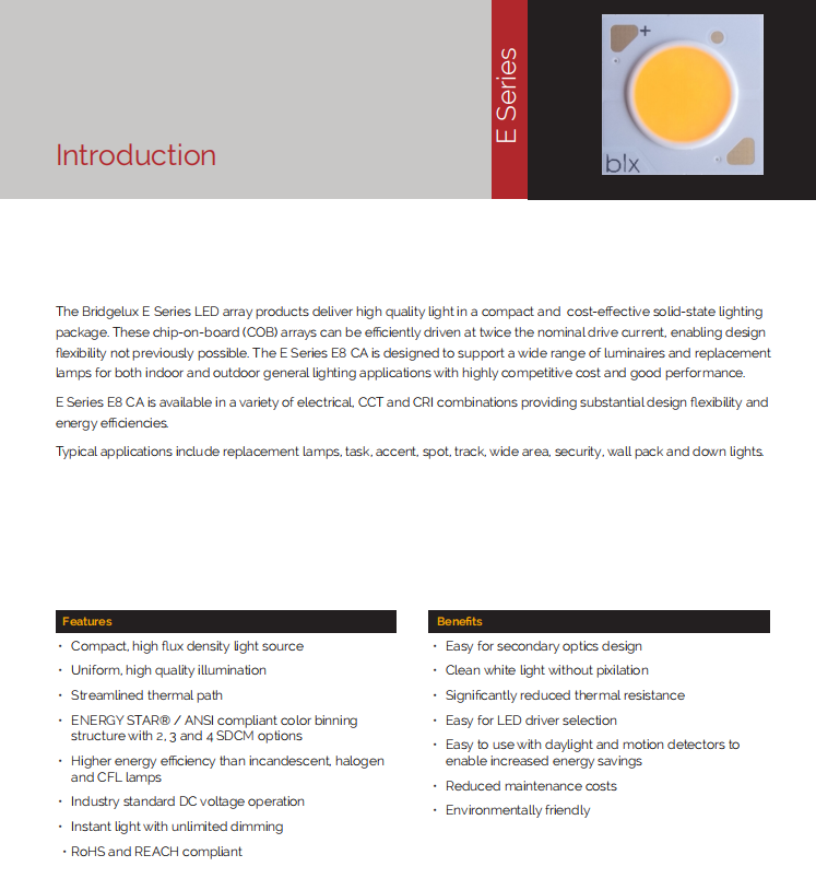 ชิป LED แบบ COB รุ่น Bridgelux E Series BXKC-30E1501-D-13 ความสว่าง 937 ลูเมน 7 วัตต์ 3000k สีขาวอบอุ่น Ra82 152 ลูเมน/วัตต์ มุมมองภาพ 120 องศา