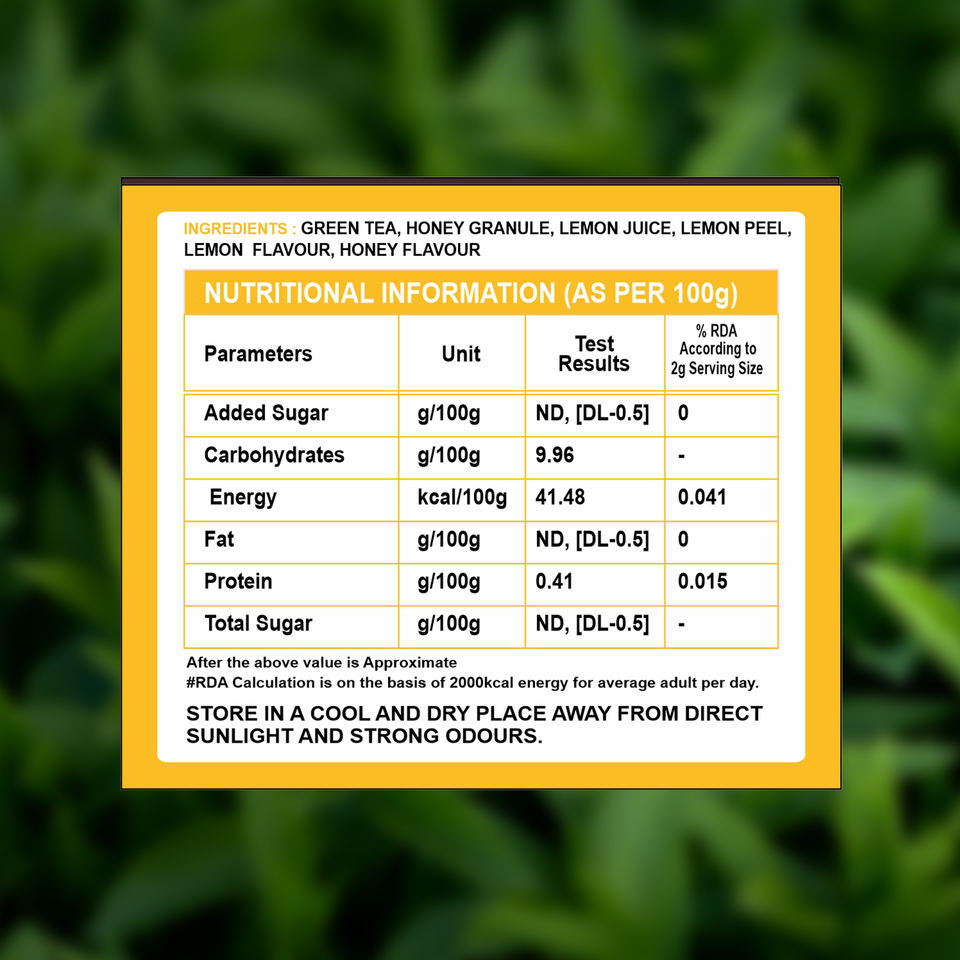 ส่วนผสม:ใบชาเขียว กลิ่นเลมอนธรรมชาติ น้ำผึ้งอบแห้ง