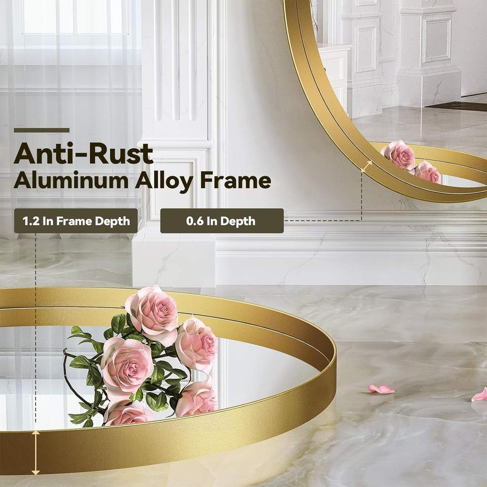กระจกห้องน้ำทรงวงรีสีทอง24X36นิ้วสว่างสดใสพร้อมกรอบโลหะกระจกติดผนังแบบทันสมัยสำหรับห้องนอนและห้องนั่งเล่น