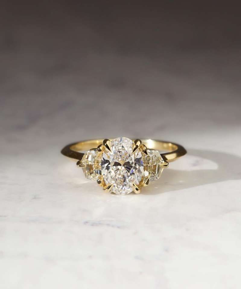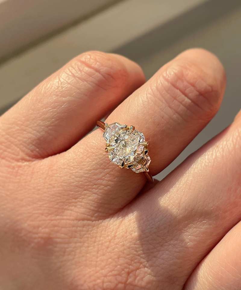 แหวนหมั้นเพชรโมอิสซาไนต์ทรงรีเจียระไนสวยงาม แหวนทองคำขาว 14K ประดับเพชรสามเม็ด แหวนเจ้าสาวสุดหรู เครื่องประดับชั้นดีสำหรับเธอ