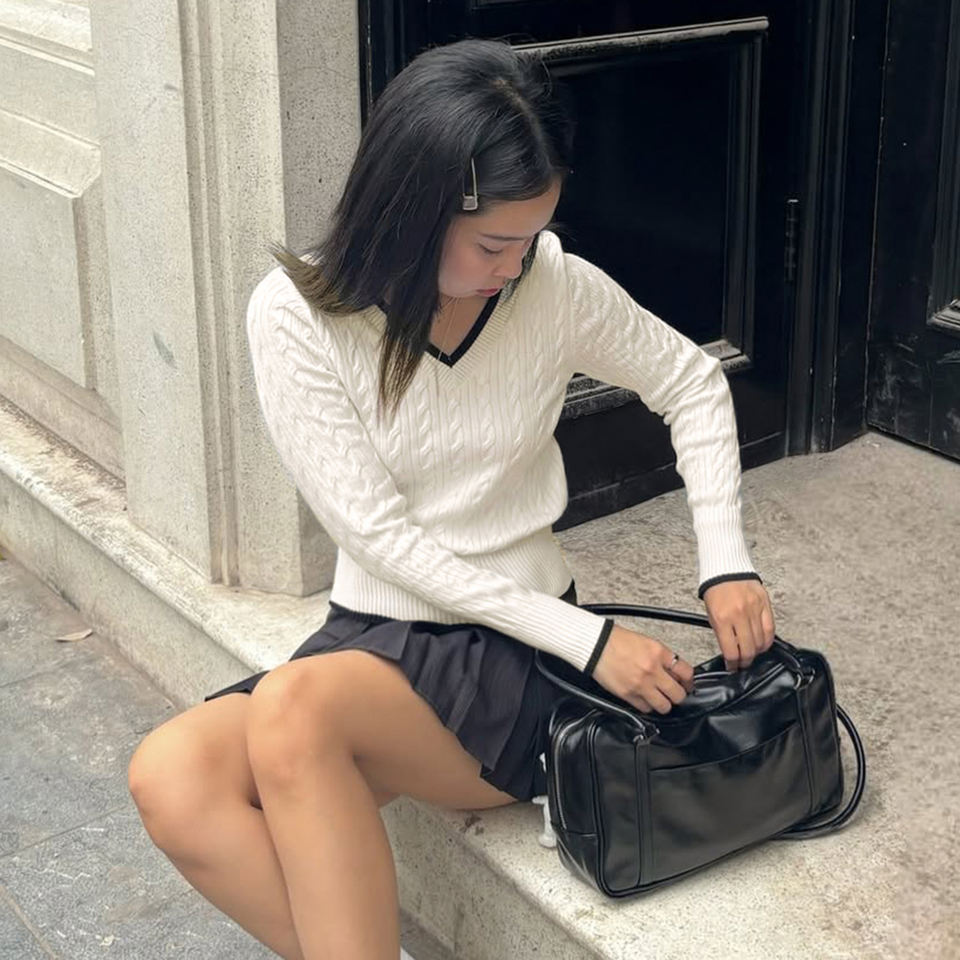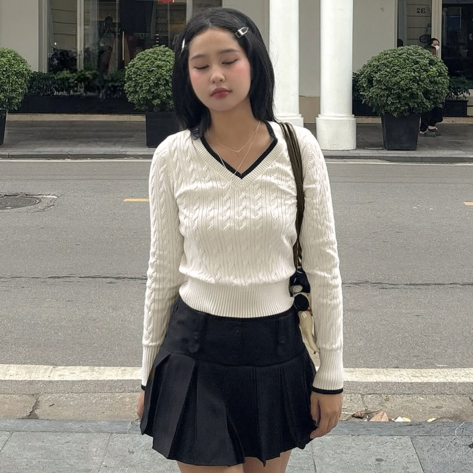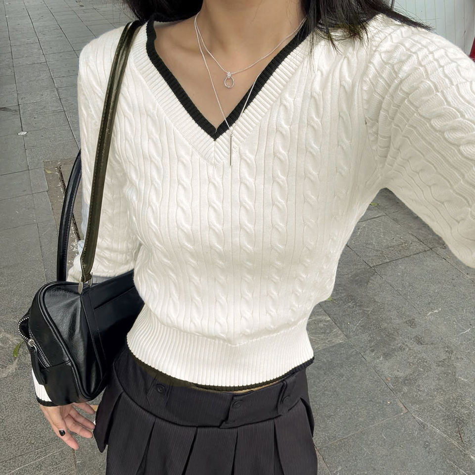 เสื้อสเวตเตอร์ถักลายเคเบิ้ลสไตล์อังกฤษสำหรับผู้หญิง คอวีตัดสี ทรงเข้ารูป กระชับเอว สไตล์พรีปปี้