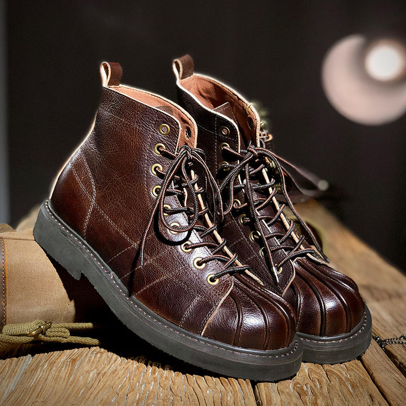 รองเท้าบูทหนังลำลองผู้ชายสไตล์เรโทรอังกฤษ พร้อมเชือกผูกแบบทันสมัยและหัวรองเท้าทรงกลมสำหรับขี่มอเตอร์ไซค์