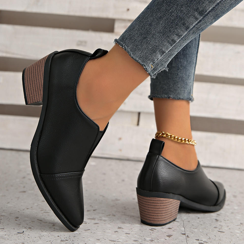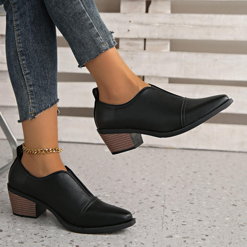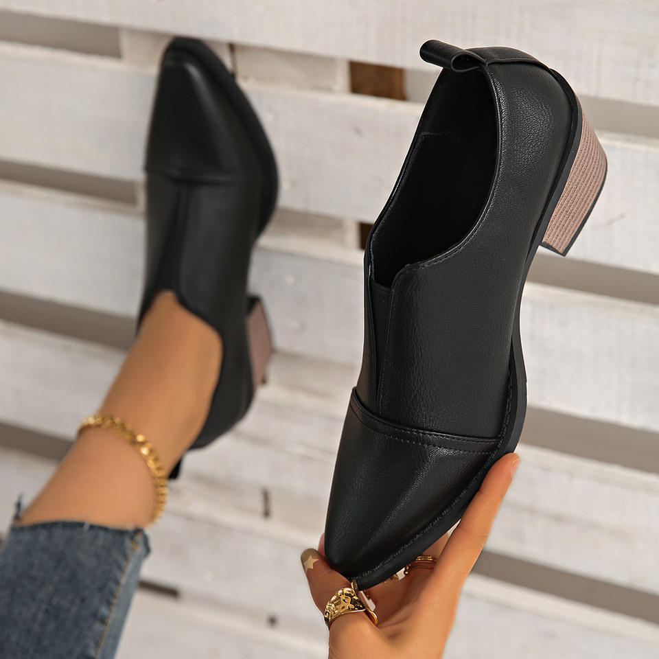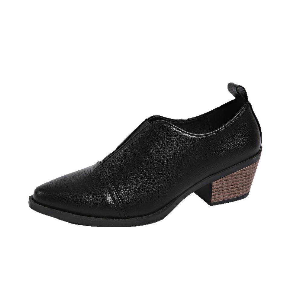 British Style Large Size Medium Heel Flats Autumn New Style Thick Heel Pointed Toe Deep Mouth Small Leather Shoes for Women