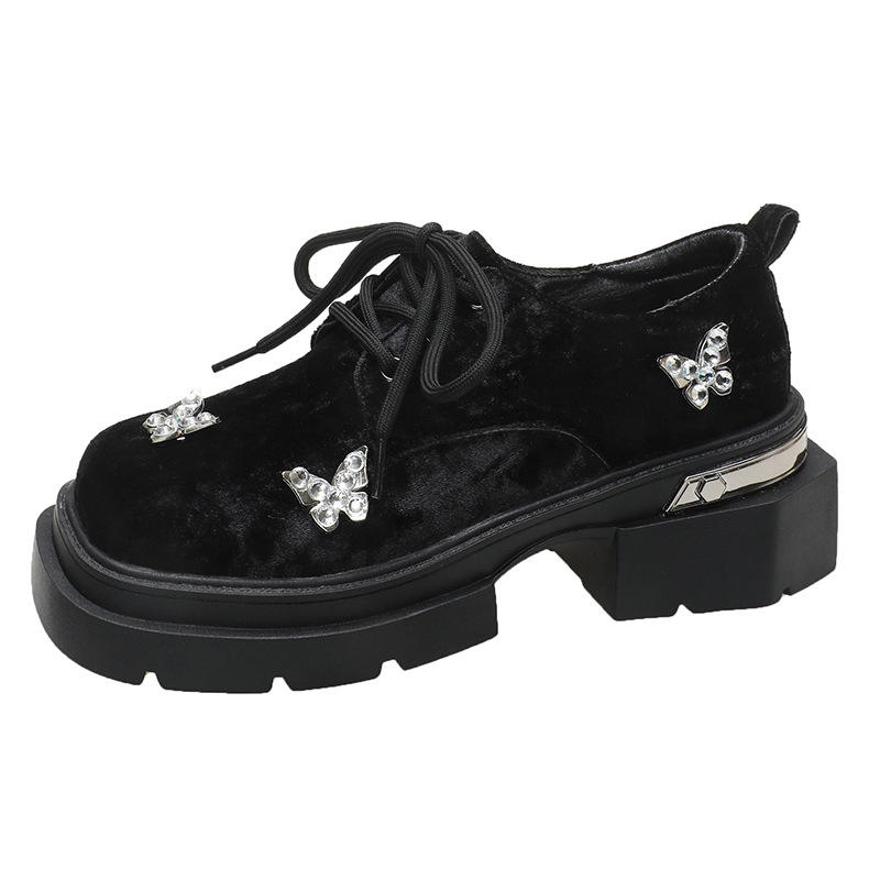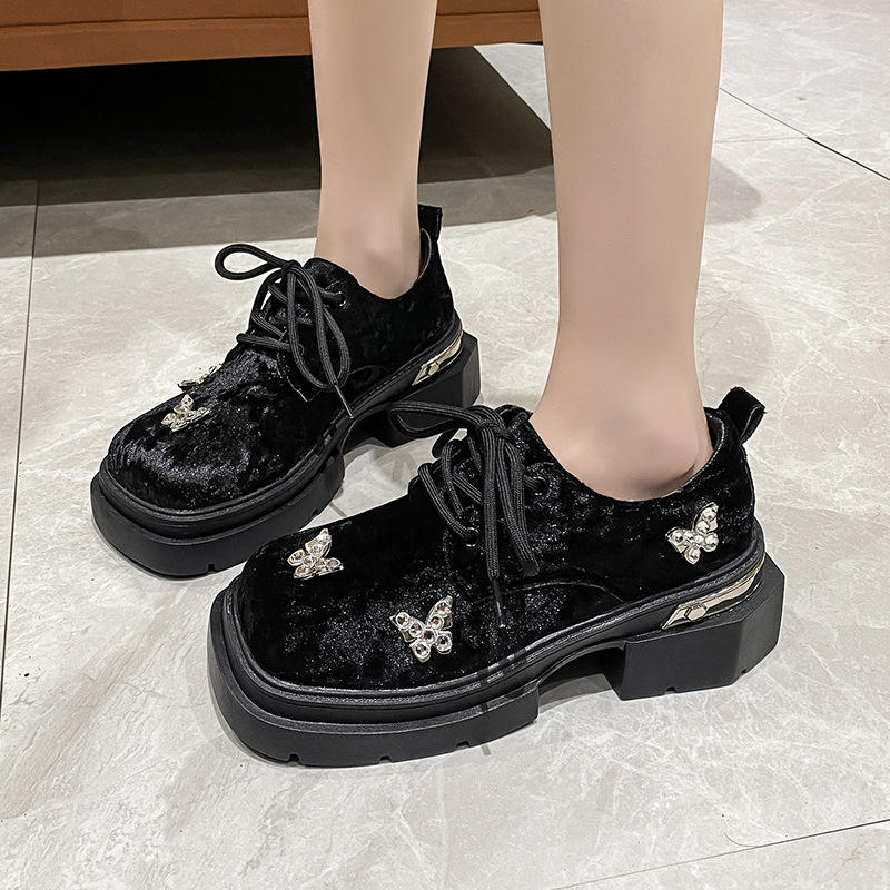 British Style Thick Rhinestone Toe Thick Heel for Women Spring Preppy Medium Heel Flats Small Leather Shoes