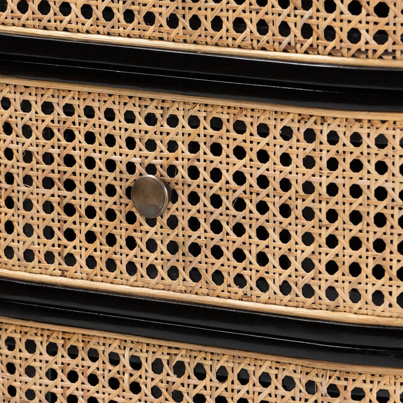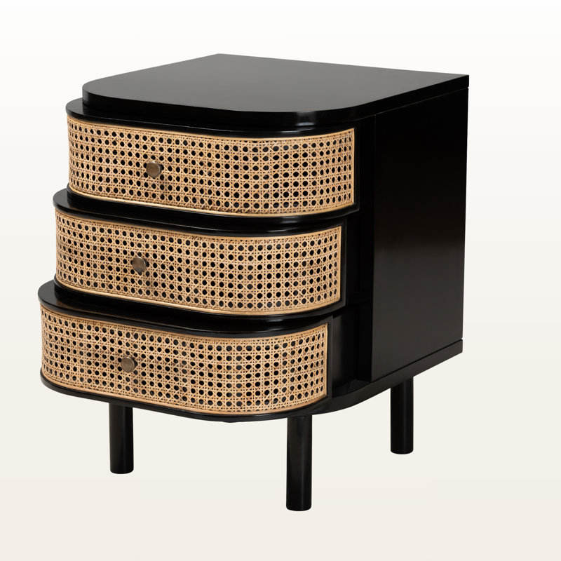 Briven โต๊ะข้างเตียง3ลิ้นชักไม้เบย์เกอร์สีดำตกแต่งด้วยหวายธรรมชาติ