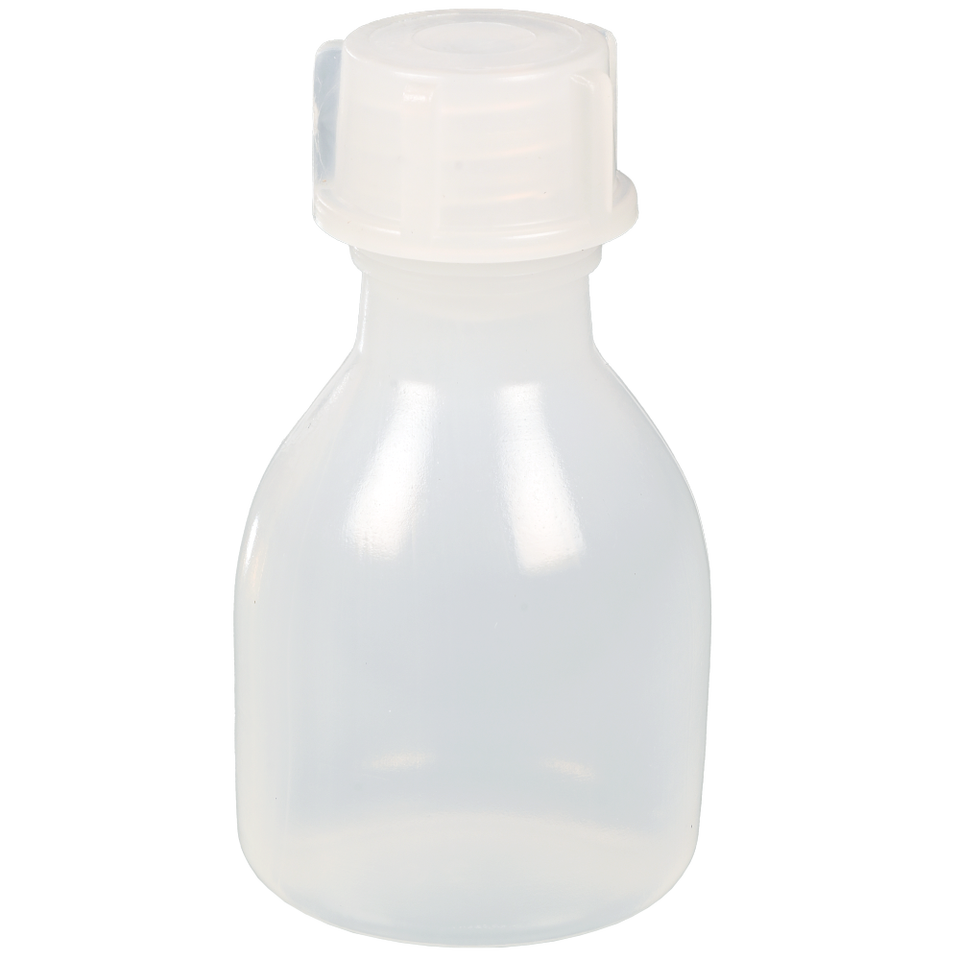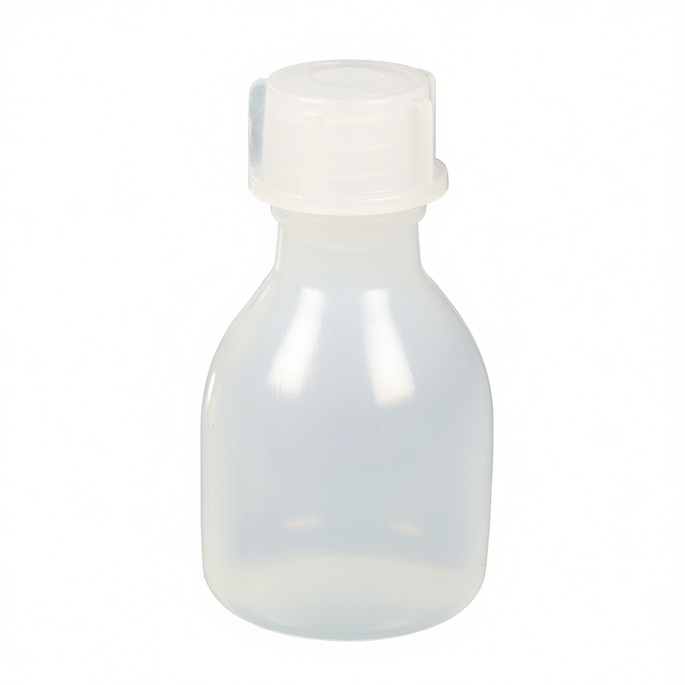 ขวดห้องปฏิบัติการทรงกลมคอแคบพลาสติกของบริษัท Brkle GmbH พร้อมหูจับตามหลักสรีรศาสตร์เพื่อการใช้งานที่ง่ายดาย ผลิตในเยอรมนี