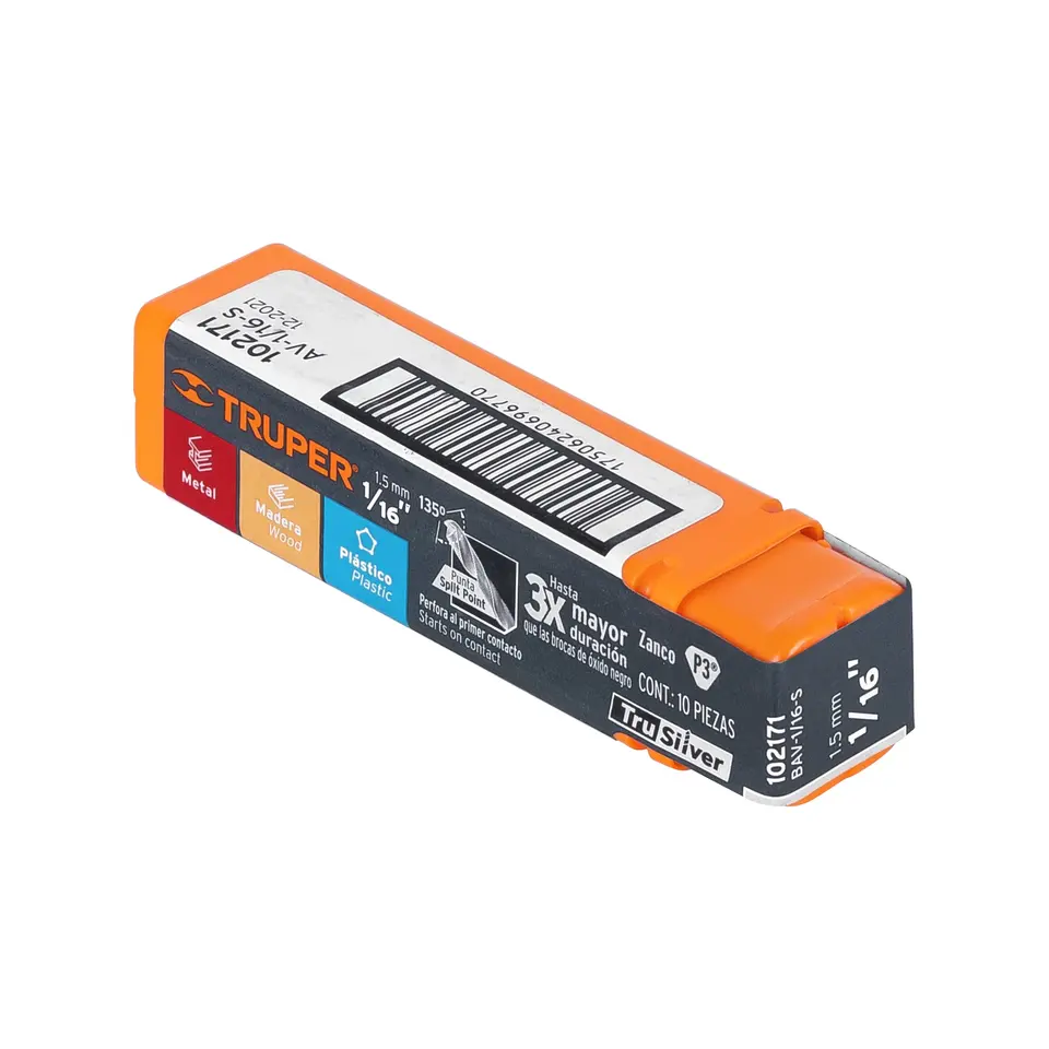 ดอกสว่าน HSS กล่อง 10 ชิ้น ขนาด 1/16 นิ้ว ตราทรูซิลเวอร์ สำหรับงานโลหะ ยี่ห้อ TRUPER