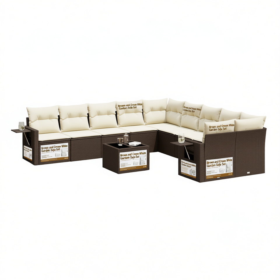 ชุดโซฟาสวนสีน้ำตาลและครีมขาว เฟอร์นิเจอร์หวายกลางแจ้ง พร้อมเบาะโฟมความหนาแน่นสูง กันน้ำ ดีไซน์ร่วมสมัย