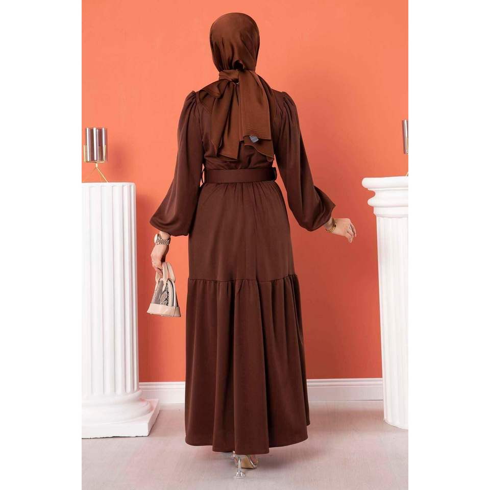 ฮิญาบยาวแต่งด้วยลูกปัดเข็มขัดสีน้ำตาลปักลายเรียบง่ายเอวทรงตรงยาวถึงพื้นลายดอกไม้อิสลาม
