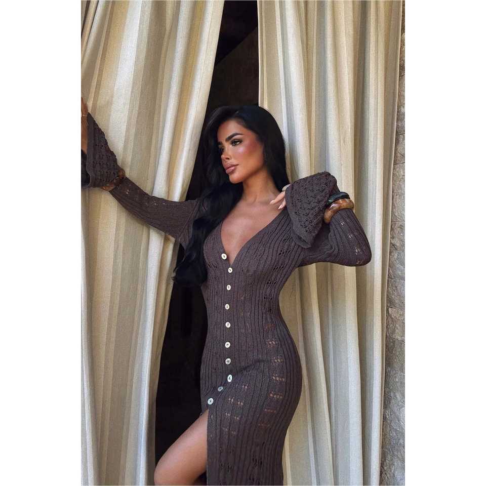 เดรสยาวสีน้ำตาลประดับกระดุมสำหรับผู้หญิง ดีไซน์หรูหรา สวมใส่สบาย เหมาะสำหรับใส่ทำงาน ตกแต่งด้วยผ้าจับเดรป โปร่งแสงเล็กน้อย ความยาวระดับพื้น สำหรับใส่ในเวลากลางวัน