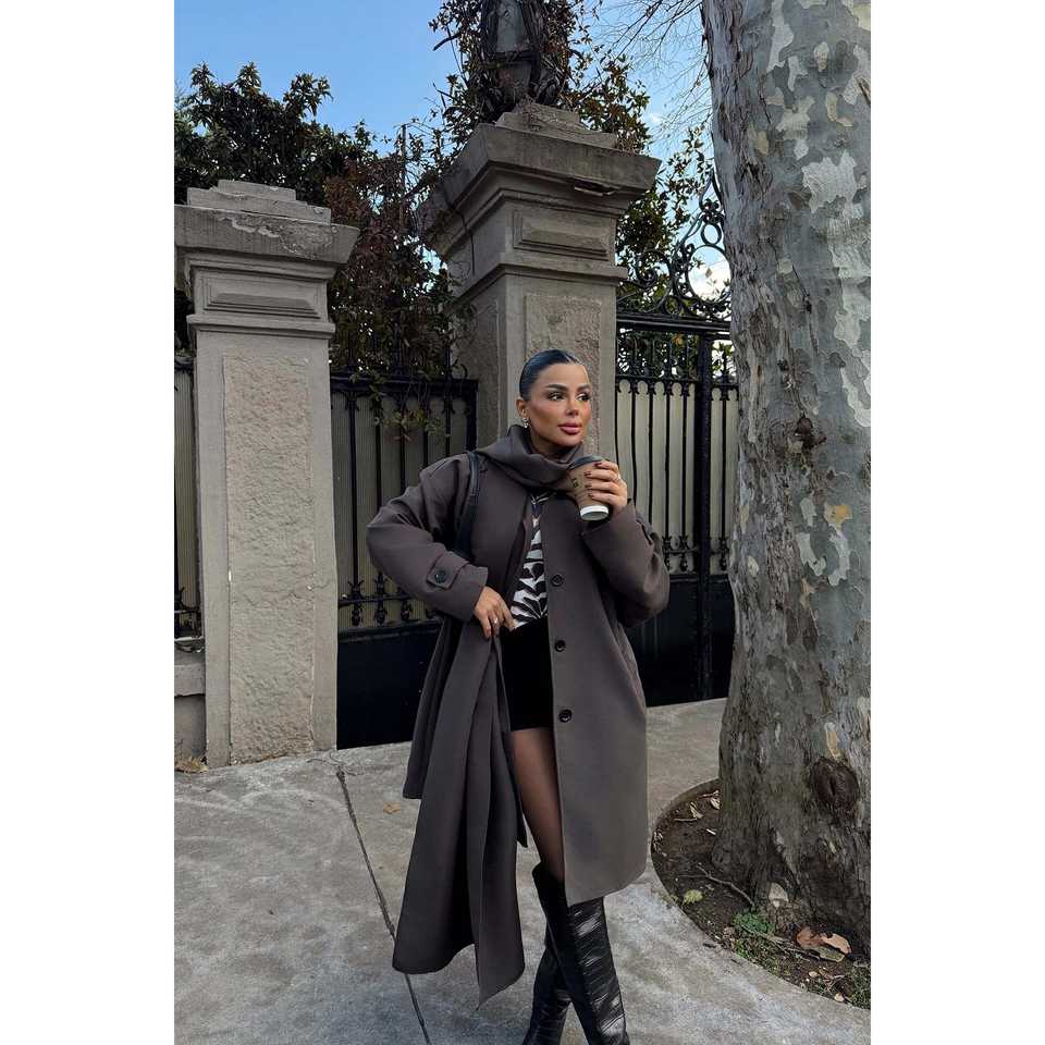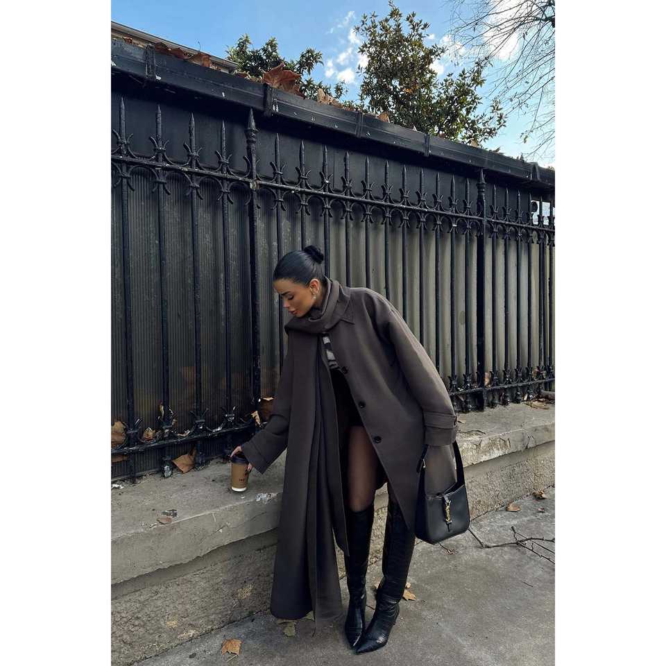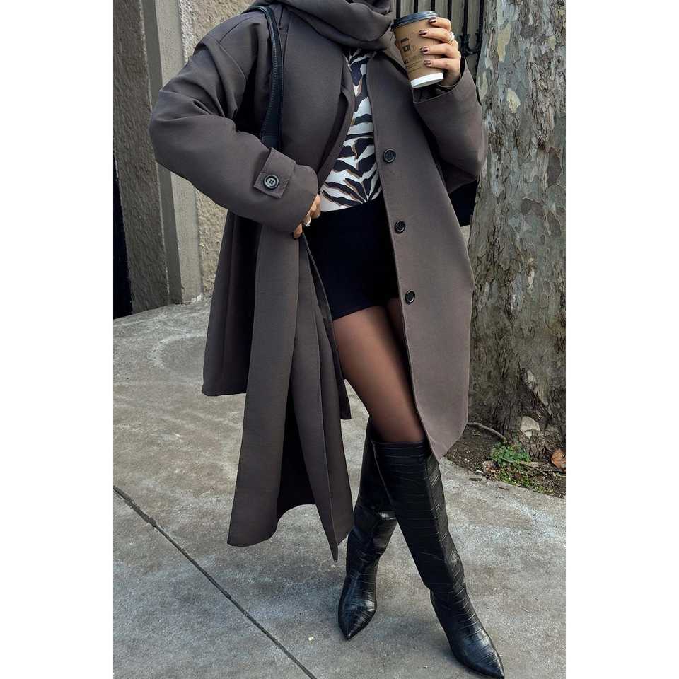 เสื้อโค้ทเทรนช์สีน้ำตาลติดกระดุมด้านหน้า พร้อมเข็มขัดตกแต่ง กันน้ำสำหรับฤดูหนาวและฤดูใบไม้ร่วง ทำจากหนัง PU บุด้วยผ้าลินินสำหรับฤดูใบไม้ผลิ ปรับน้ำหนักได้ตามต้องการ