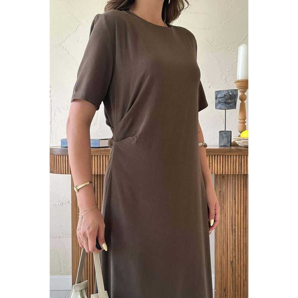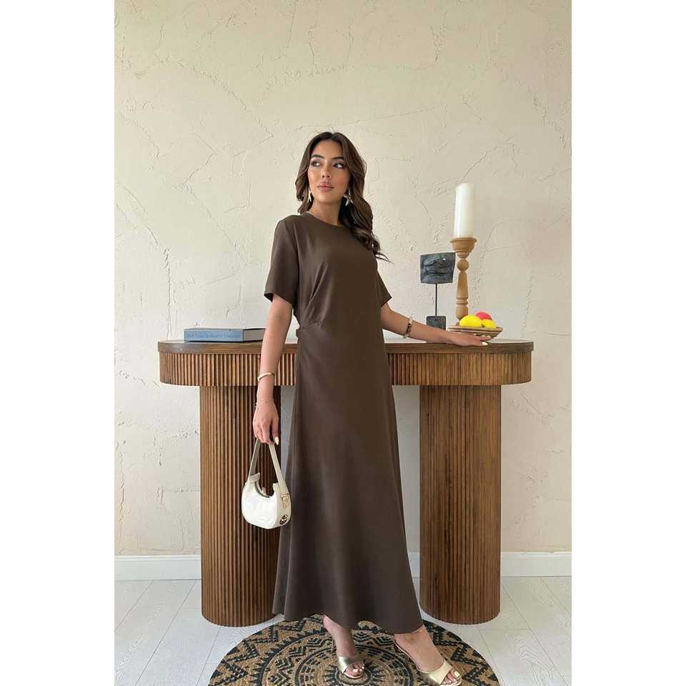 เดรสสีน้ำตาล คอปก แขนยาว จับจีบ เอวธรรมชาติ ผ้าทอ ระบายอากาศได้ดี ใส่ได้ทุกวัน สไตล์ลำลอง