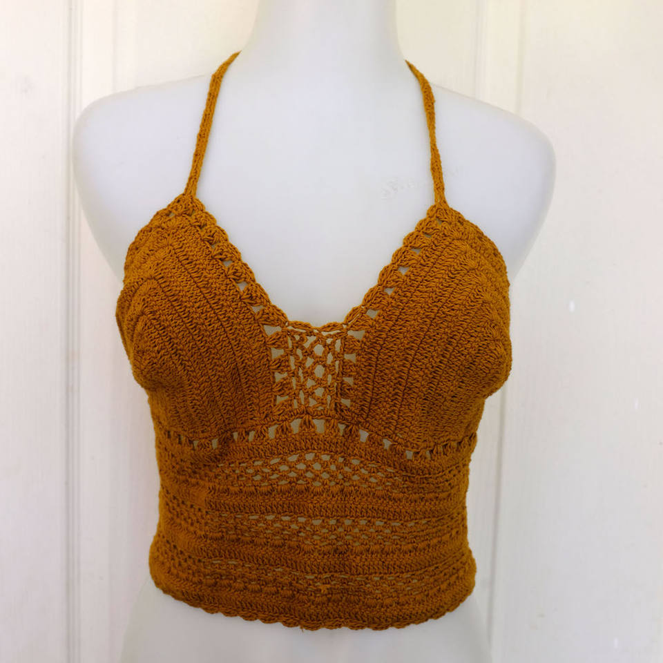 ชุดครอปถักโครเชต์สีน้ำตาลสำหรับฤดูร้อน,บิกินี่ชายหาดแฟชั่นผู้หญิงสำหรับฤดูร้อนเสื้อครอป Macrame แฮนด์เมด