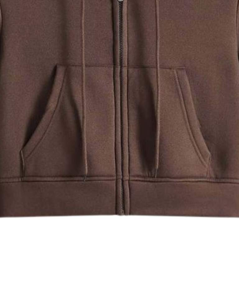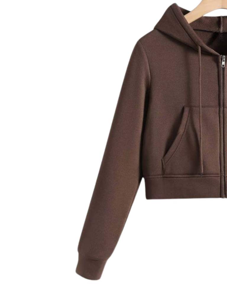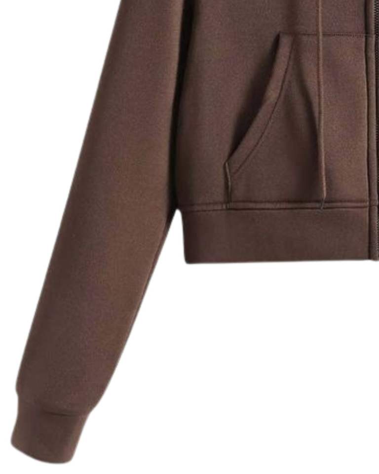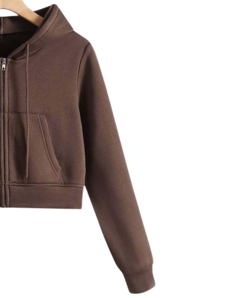 เสื้อฮู้ดครอปสีน้ำตาลแบบซิปสำหรับผู้หญิง เสื้อสเวตเชิ้ตมีฮู้ดผ้าฟลีซ ทรงเข้ารูป สไตล์ลำลอง สตรีทแวร์ เสื้อแจ็คเก็ตสำหรับฤดูใบไม้ร่วงและฤดูหนาว