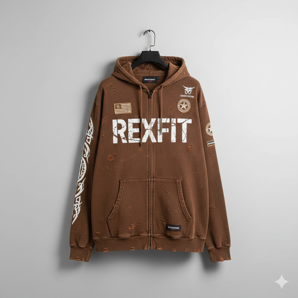 เสื้อฮู้ดซิปสีน้ำตาลสไตล์วินเทจ พร้อมลายพิมพ์ REXFIT ผ้าพรีเมียม ซิปปิด กระเป๋าจิงโจ้ สไตล์สตรีทแวร์ สำหรับผู้ชาย ใส่ได้ในฤดูหนาว