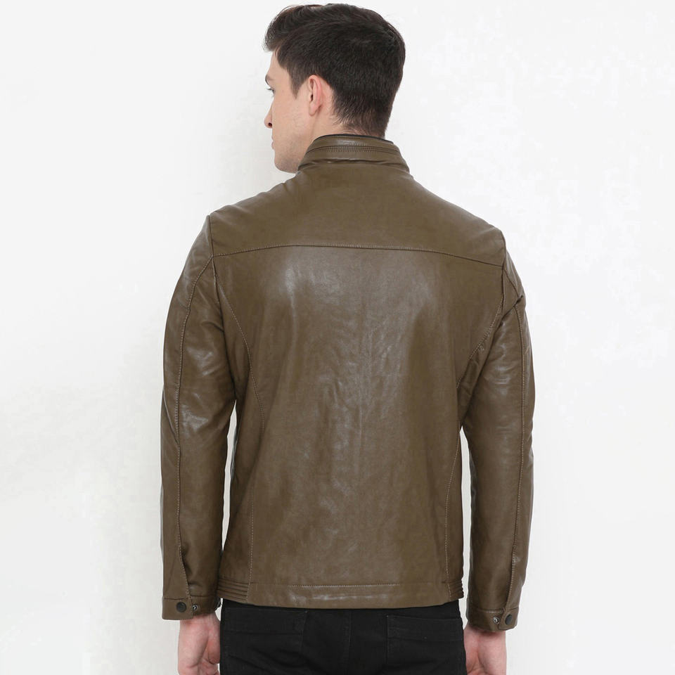 เสื้อแจ็คเก็ตหนังแท้สีน้ำตาลทรงเข้ารูป คอตั้ง แฟชั่นสำหรับผู้ชาย พร้อมโลโก้และป้ายสั่งทำพิเศษ ระบายอากาศได้ดี เป็นมิตรกับสิ่งแวดล้อม มีทุกขนาด
