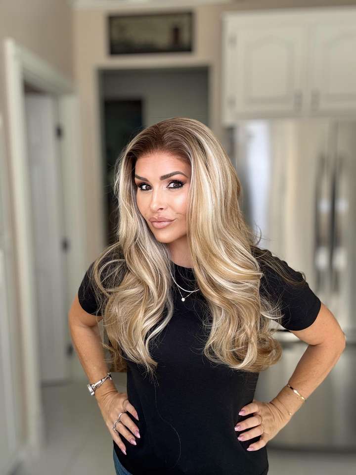 วิกผมสังเคราะห์แบบลูกไม้ด้านหน้า 13x4 รุ่น Futura สีบลอนด์ไฮไลท์น้ำตาล ลอนใหญ่พิเศษ พร้อมหน้าม้าตรงกลาง แบบไม่ต้องใช้กาว ลูกไม้โปร่งใส